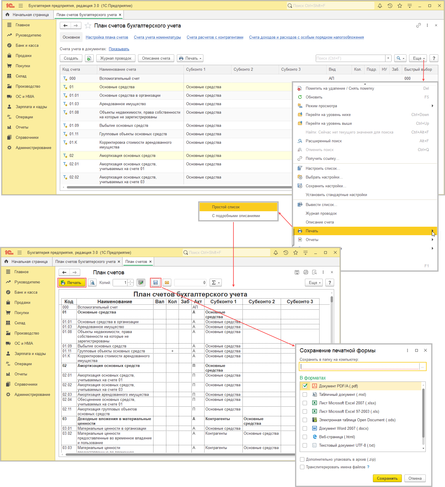 - Чтобы сохранить список (табличный документ) с планом счетов в файл или вывести его на печать, по кнопке «Еще» выберите команду «Печать» и затем вариант представления — «Простой список» или «С подробным описанием» (рис. 2).